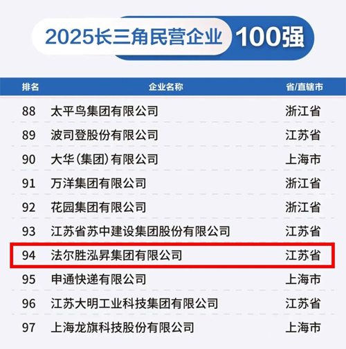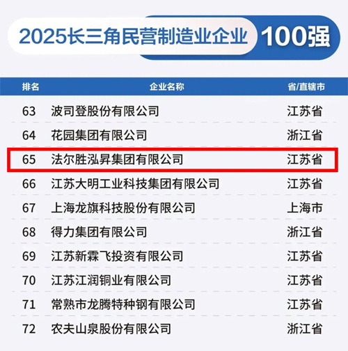 根据发布榜单,法尔胜泓昇集团荣登2025长三角制造业企业100强、2025长三角民营企业100强、2025长三角民营制造业企业100强榜单!