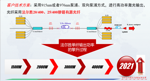 报告中,赵霞总经理表示,面对中高功率光纤激光器市场的快速增长,高功率光纤激光器的应用是未来市场发展的必然趋势,核心器件的国产化应用也是企业发展的巨大机遇。光纤激光器的前沿技术要求光纤在光纤尺寸、数值孔径、光纤组分及光纤结构方面做出新的突破和迭代,法尔胜通过近三年的不懈探索和努力,自主研发的20/400和25/400掺镱有源光纤凭借产品优良的一致性和稳定性,成功推向市场,实现产业化,研发过程中,公司不断追求并实现单纤1500W到4000W以上功率水平的提升。