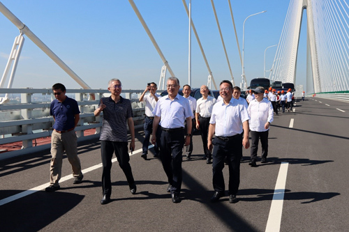 上午,在周江董事长的带领下,与会人员踏上常泰长江大桥,近距离感受这座承载“六个世界之最”的“钢铁巨龙”的磅礴气魄。
