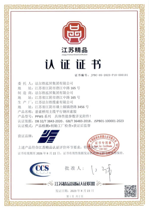 近日,法尔胜生产制造的悬索桥用主缆平行钢丝索股产品通过了“江苏精品”认证!