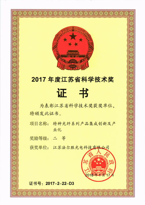 近日,由法尔胜泓昇集团、光电公司和光子公司共同合作完成的“特种光纤系列产品集成创新及产业化”项目荣获“江苏省科学技术进步奖二等奖”。