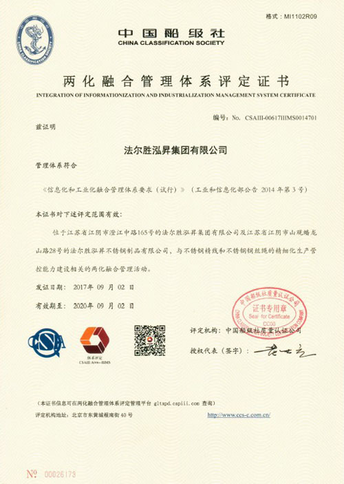 2017年9月4日,法尔胜泓昇集团有限公司顺利通过工信部两化融合服务联盟专家委员会合规性审查、复核及公示,并获得工信部两化融合服务联盟、中国船级社颁发两化融合管理体系认证证书。