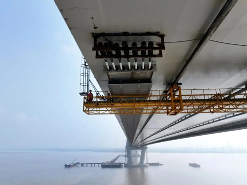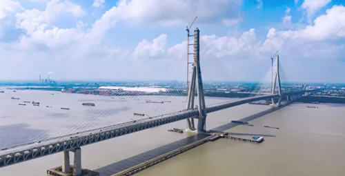 此前,大桥在350米高主塔施工过程中已相继实现了减冲刷减自重台阶型沉井基础、“钢—混”混合结构空间钻石型桥塔和钢箱—核芯混凝土组合索塔锚固结构等三项世界首创设计。至此,大桥工程四项世界首创设计全部成功落地,这是国内超大跨径桥梁在新结构、新材料、新设备、新工艺等方面的重大技术突破。