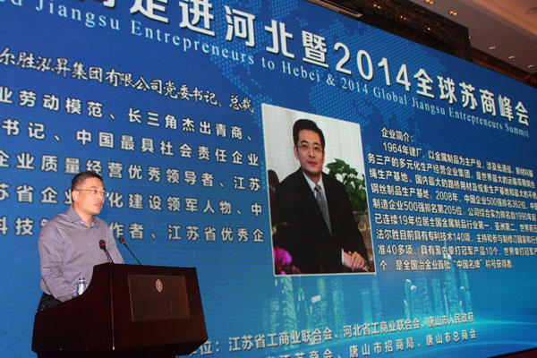 9月11日下午,知名苏商走进河北暨2014全球苏商峰会在唐山市开幕。500余名知名江苏民营企业家代表汇聚唐山,共享京津冀协同发展机遇,共创苏冀合作新商机。