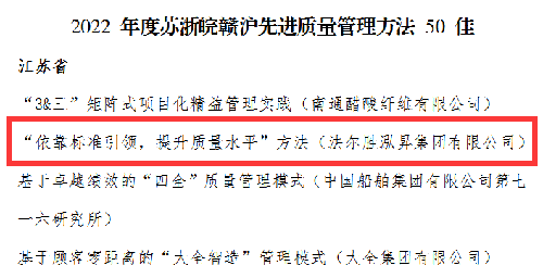 近日,苏浙皖赣沪五省市场监督管理局联合发文宣传推广50家单位的先进质量管理方法法尔胜泓昇集团的“依靠标准引领,提升质量水平”方法榜上有名。