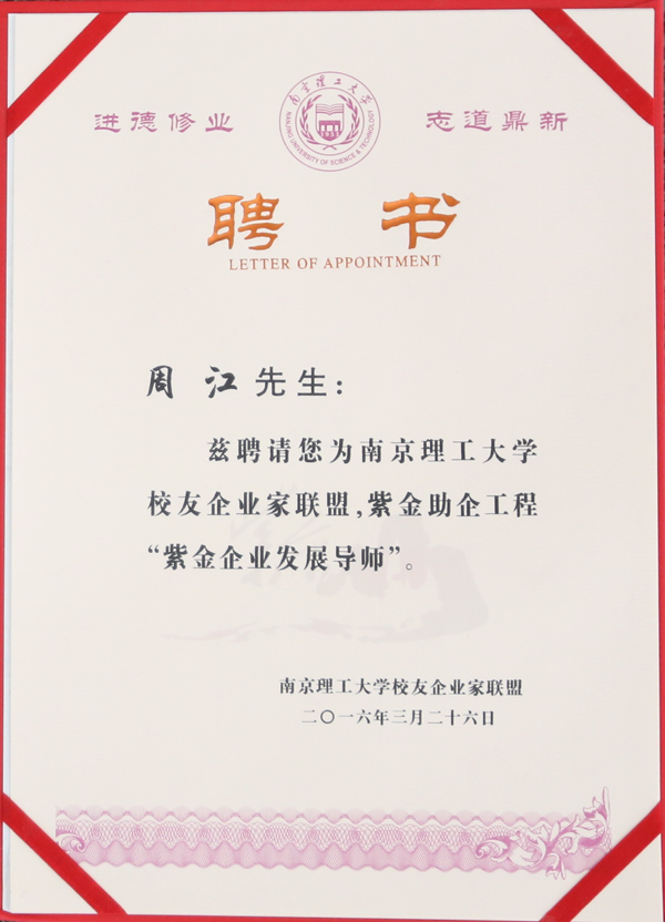 集团公司董事长、党委书记、总裁周江作为南理工88级校友出席成立仪式,并当选校友企业家联盟首届理事会理事长,在下午举行的南京理工大学紫金助企工程启动仪式上,周江董事长还被聘为紫金企业发展导师。